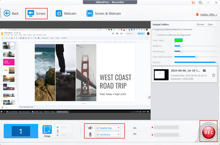 Step 4. Hit the red button to start recording. Now get back to Google Slides and make a voiceover. VideoProc Converter AI will record your presentation with audio until you click the stop button.