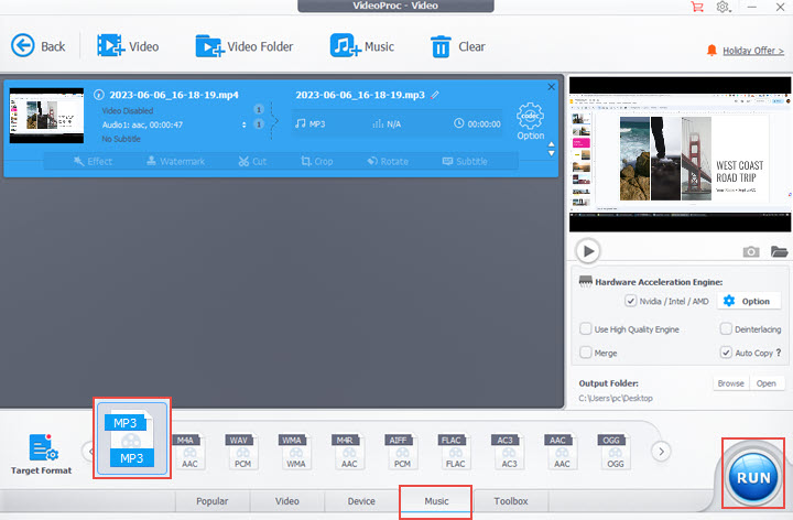 Step 5. Open the output folder of the recording. Go back to the main UI of VideoProc Converter AI and choose "Video". Drag and drop the screen recording file to it. Click "Music" > "MP3" > "RUN" to save the audio recording to your computer.