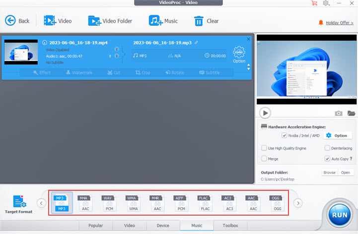 Step 4. Exit from the Recorder center. Click "Video" on the main interface. Drag and drop the recording file to it. Click "Music" at the bottom bar to select an audio format, such as MP3. Click "RUN" to export. Now you get an audio recording file with the internal sound or mic sound on Windows 11.