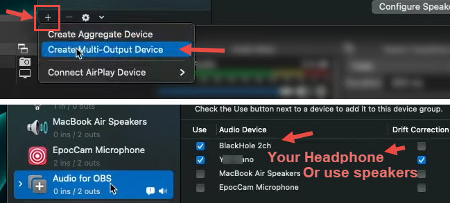 Step 4. Give it a name, such as Audio for OBS. You can use any other names. Then make sure BlackHole 2ch and your headphone are ticked.
