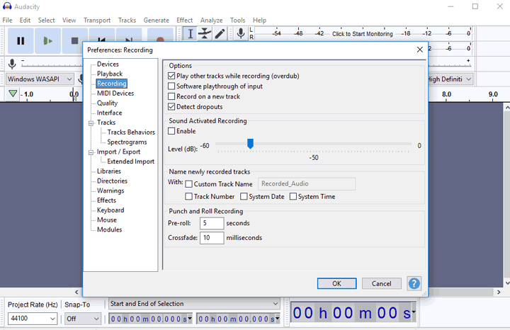 Step 6. Click the red round icon button. Enter the sample rate, channels, and resolution on the pop-up window. Hit OK. Ocenaudio starts to record internal audio on Windows 10.