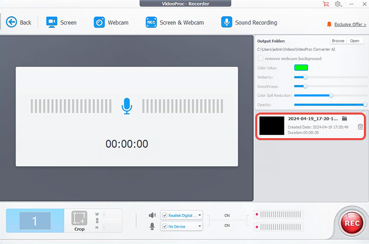 Step 3. Play the audio you wish to record. Click REC to initiate the recording and click Stop to end it. VideoProc Converter AI saves your recording as an M4A file which can be accessed by clicking the file folder icon.
