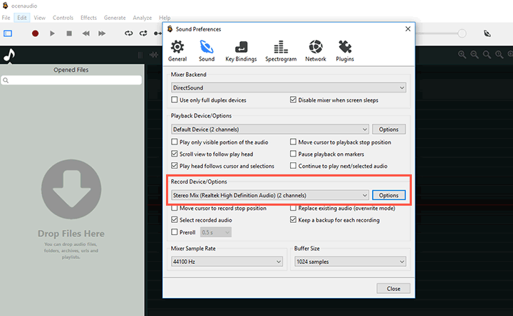 Step 5. Go to the Record Device/Options section and select Stereo Mix (Realtek High Definition Audio) as the target device. Hit Close to exit the Sound settings panel.