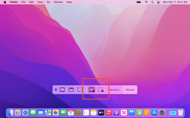 Step 2. Select the screen recording icon on the left to record the whole screen or the one on the right to record a portion of the screen. If you're recording a portion of the screen, drag your cursor to specify the part you wish to record. Then, click Record.
