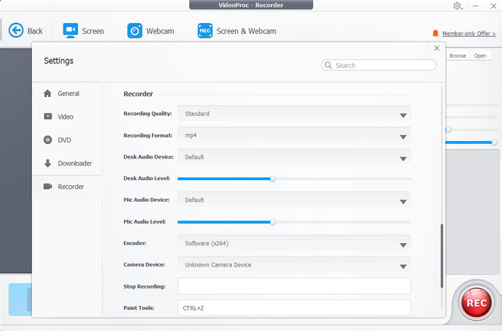 Step 2. Tap Recorder on the home page of VideoProc Converter AI, and select a recording mode. Click on the Wrench icon at the top-right corner to configure recording settings like video quality, format, output path, and others.