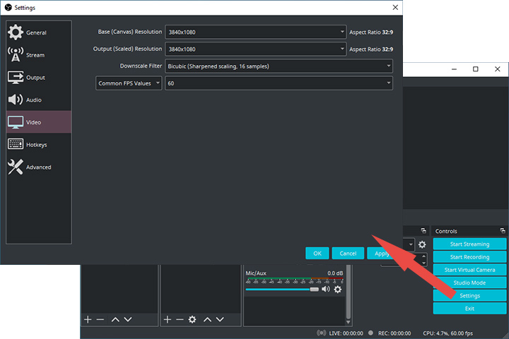 - Set Base Resolution and Output Resolution to twice the width of your screen. For example, set the recording resolution to 3840x1080 for a 1920x1080 screen.