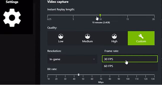 In the Video capture panel, you can set recording FPS, resolution, quality (low, medium, high), Instant Replay length (from 0.25 to 20 minutes), and bitrate.