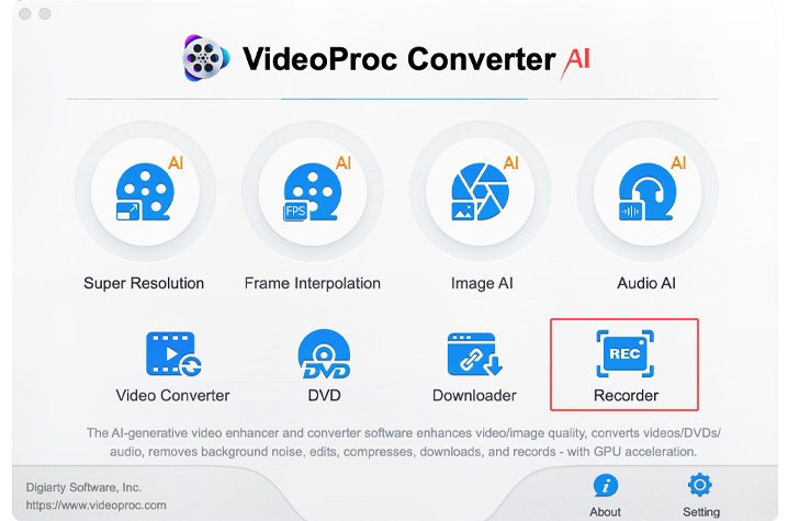 Step 1. Run VideoProc Converter AI on your Mac computer and click on Recorder icon on the main page.