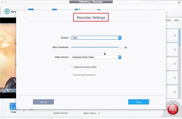 Step 2. Click Recording Settings on the top bar, set the quality, max framerate, video device, and more. Click Done to continue.