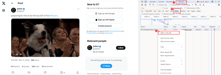 Step 1: Open Twitter on your browser and go to the GIF you want to download. Right-click and choose Inspect - Network - Media - Open in new tab.