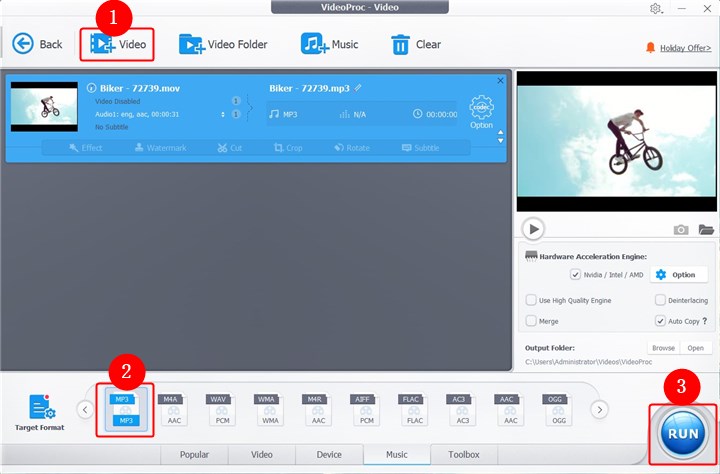 Besides, owing to VideoProc Converter AI supporting level-3 hardware acceleration technology, no matter how long your OBS recording video file is, it will convert it into an audio file costing the least time compared to the other applications out there.
