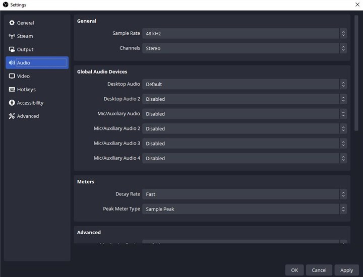 Step 3. Then in the new Settings window, go to the Audio option from the left panel. Under the Global Audio Devices, we need to decide which audio source(s) or sound devices will be recorded. For example, for users who would like OBS to record game audio only, you can just set the Desktop Audio to the Default option, and then disable all other output and input sound sources which may contaminate your game audio. So based on your own preference, make the choice.