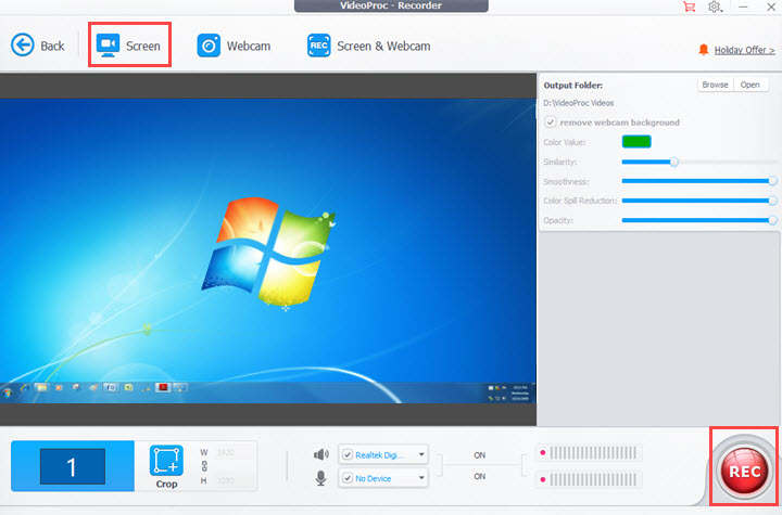 VideoProc Converter AI can come to your help if you want to record a screen with audio for free. It lets you record the in-app audio as well as external audio via a microphone. Besides, it runs on Windows 7 smoothly and puts no time limits.