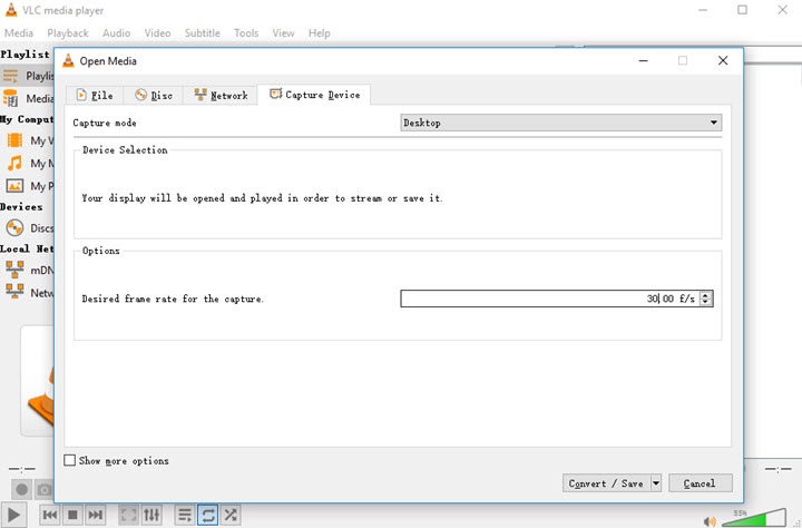 Step 2. Go to "Media" > "Convert/Save". Then open the "Capture Device" tab.