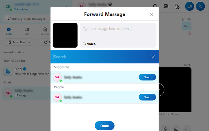Click on the ellipse button next to the thumbnail of your recording and hit Forward. If you need to share more than one Skype call recording, then hit Select Message, check the thumbnails of the target recordings, and then hit Forward. This can open the contact page, here in select the friends who you want to share the recording with.