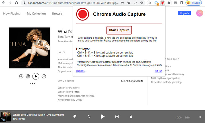 Find the Chrome Audio Capture icon (usually located in the toolbar) and click on it. Select Start Capture to begin recording the streaming audio. When you're finished, click on Save Capture to stop the recording. A new tab will appear with a pop-up message. Click on Save Capture again to download the recording onto your local disk.