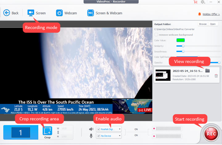 To record lives streams from other YouTube channels, we need help from a decent screen recorder – VideoProc Converter AI. It's a versatile video processing program built with a 4K screen recording tool for Windows and Mac. It gives you full control over the recording area, sound settings, frame rate, and output format for all needs. Another benefit of using an offline recorder is that it won't interfere with the ongoing YouTube lives, thus delivering a smooth recording. Meanwhile, you can use its built-in downloader to download streaming lives, videos, playlists, M3U8, and music from 1000+ sites with ease.
