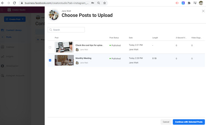 Step 3. Repost a video from Facebook to Instagram in Facebook Creator Studio.