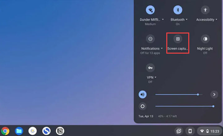 Step 1. Click the system tray on the bottom-right corner on your Chromebook. Click Screen capture.
