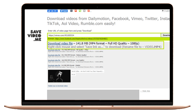 With couples of websites supported, savevideo.me can help you download videos from not only Vimeo, but also Dailymotion, Facebook, Instagram, etc. However, based on our test, it can't analyze YouTube videos. You will be able to choose output quality, but 4K videos are not downloadable through online Vimeo downloader.