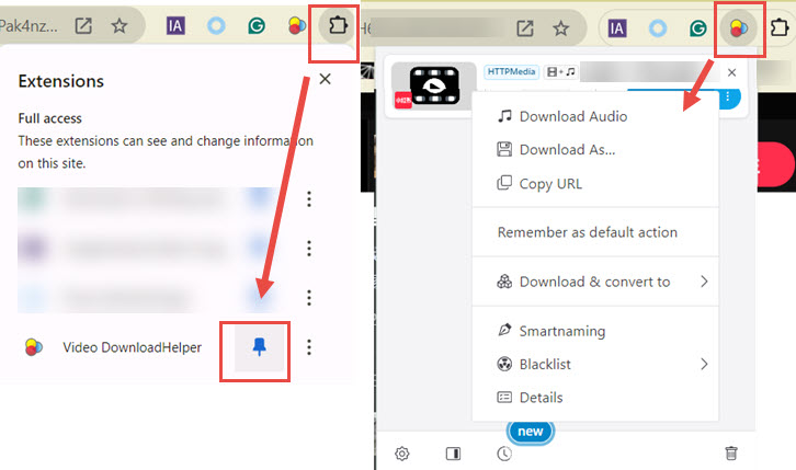 Note: After installing, make sure to click the extension icon and pin the Video DownloadHelper so that you can see it on the toolbar in the browser.