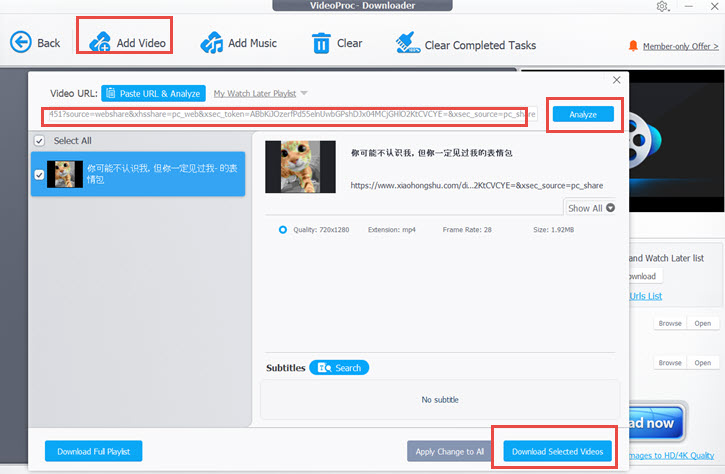 Inside the web app, you can save the videos or images directly via the Share icon, just as we demonstrated in method 1. However, if the OP toggles off the save option, or if you prefer to download Xiaohongshu videos in batch, you can resort to VideoProc Converter AI for easy batch downloading.