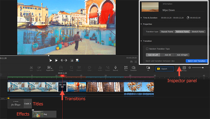 The ways to apply these elements are almost the same. Drag the title template onto Overlay Track. Drag the effect preset to Effect Track. To add a transition, drag the transition preset in-between two 4K videos clips. You can then adjust the applied transition, title, or effect on the Inspector panel located on the right of the preview window.