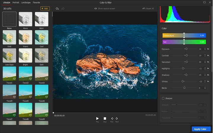 Select the Color button under the preview window. On the pop-up new panel, you can find 90+ stylish 3D LUTs presets. To add a loved LUT, simply click on it. Drag the Intensity slider located on the right side of the panel to adjust the intensity of the applied LUT. Herein, you can also adjust the parameters of hue, temperature, contrast, and dozens of other options to color grade your videos.