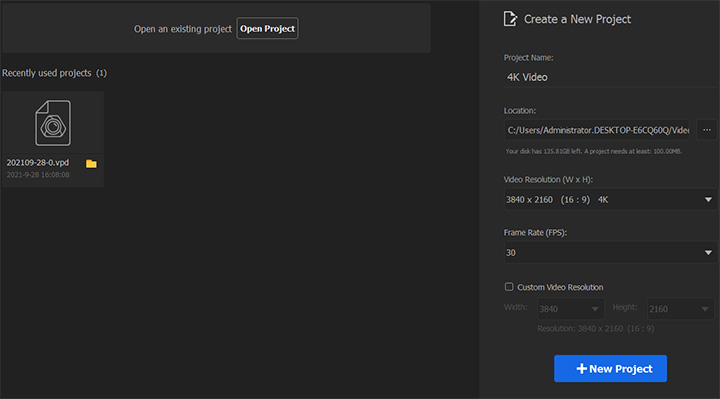 Launch up VideoProc Vlogger. Enter the new project name and assign a new project location. Select 3840 x 2160 (16:9) 4K on the Video Resolution menu. By default, the program creates the project at 30fps which is the most commonly used frame rate. What's worth noting is GoPro, DJI, and many 4K capable cameras shoot 4K videos at a high frame rate.