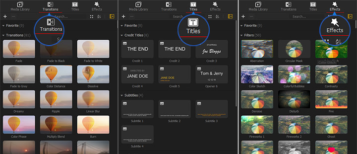 Go to the top of the Media Library panel. You can then click on the Transitions, Titles, or Effects button to open up the relevant panel for making the edits.