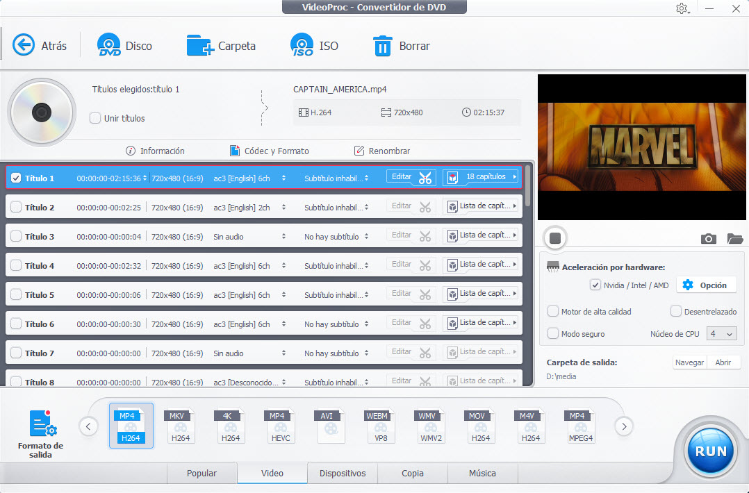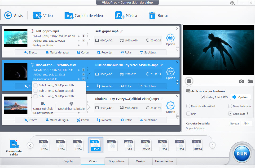 VideoProc Converter Una caja de herramientas completa para procesar videos: transcodificar, remuxear, comprimir, cortar, recortar, fusionar videos HD/4K/8K con una relación tamaño-calidad perfecta. Convierte prácticamente cualquier formato de video/audio, por ejemplo, MKV, MP4 (HEVC), MP3, WAV, WMA, M4A, OGG.