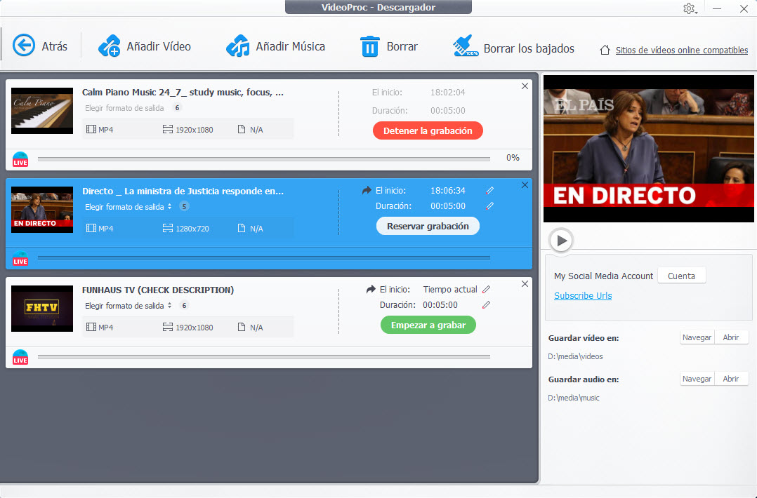 Motor incorporado para descargar vídeo, vídeos en directo, lista de reproducción, canales y audio de YTB, Facebook y otros sitios UGC, y guardarlos en resoluciones y formatos diferentes.
