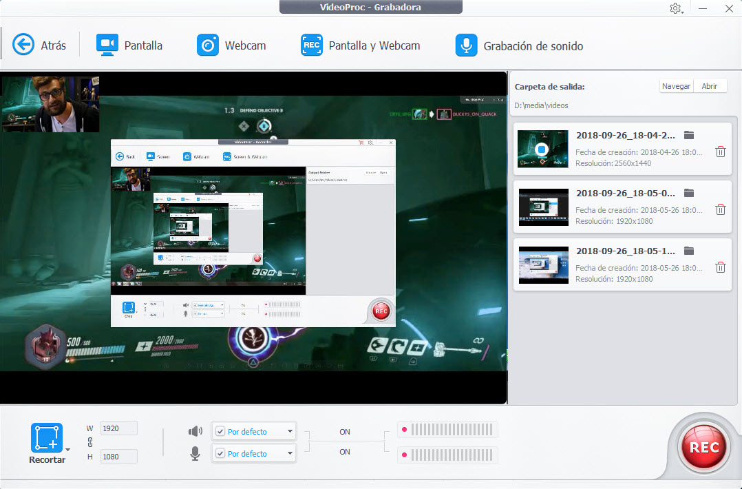Para los jugadores, amantes del deporte, educadores e influencers de YouTube/TikTok, VideoProc Converter AI es el software ideal para grabar la pantalla, la webcam y el audio. Te ayuda a grabar jugadas, presentaciones, seminarios web, llamadas de Skype y transmisiones en vivo; así como a crear vlogs, screencasts, podcasts, cursos en línea, reseñas de productos e instrucciones en video. Permite grabar videos en pantalla dividida directamente, videos con fondo verde para cambiar el fondo mientras grabas sin necesidad de post-procesamiento, y capturar sonidos del sistema y tu voz.