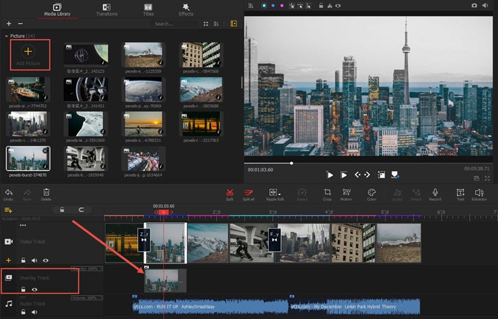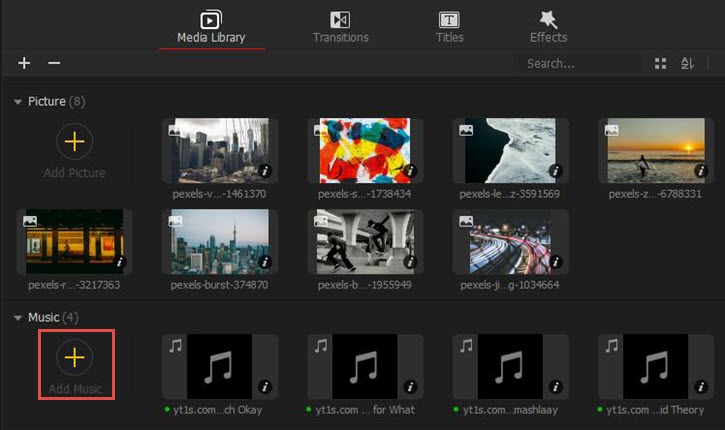 Under Media Library tab: click Pictures and click Add Picture to upload your photos from local computer disk. Then drag the photos you uploaded to the VideoTrack.