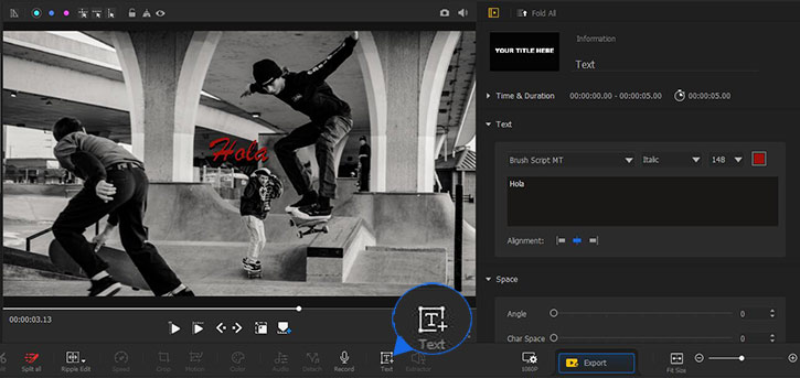 Click Text icon under the preview window to add text. You can set the font, text color, text space, text angel, text border, text shadow, etc.