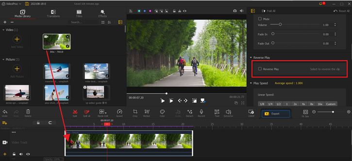 Drag the video to the Video Track. Select the video clip you want to reverse and then check Reverse Play in the edit panel on the right.