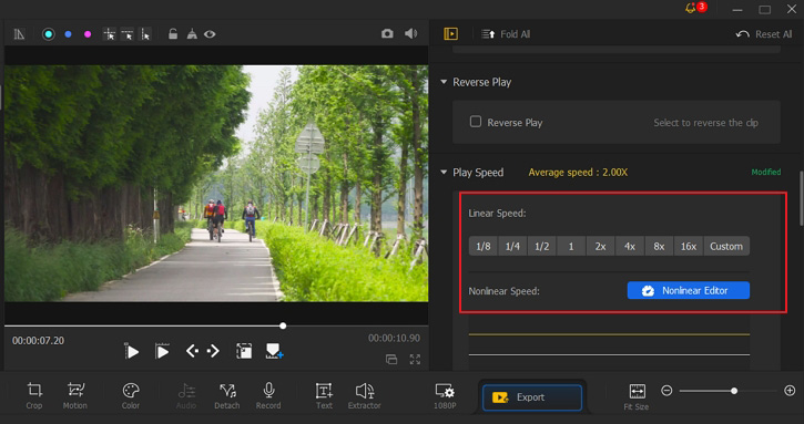 In the edit panel on the right, choose the play speed for your reversed video. You can also click the Nonlinear Editor to set the speed.