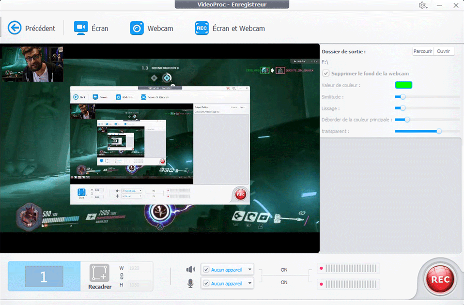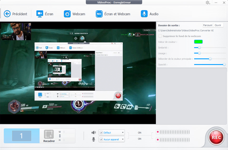 Pour les gamers, les passionnés de sport, les éducateurs et les influenceurs sur YouTube/TikTok, VideoProc Converter AI est le logiciel de choix pour enregistrer l'écran, la webcam et l'audio. Il vous aide à enregistrer des parties de jeux, présentations, webinaires, appels Skype et live streams; et à créer des vlogs, screencasts, podcasts, cours en ligne, critiques de produits et tutoriels vidéo. Il vous permet d'enregistrer directement « image dans image », de filmer avec un fond vert pour changer d'arrière-plan pendant l'enregistrement sans post-traitement, et de capturer les sons du système et votre voix.
