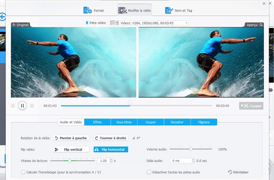 TournerVideoProc Converter AI peut faire pivoter votre vidéo à gauche ou à droite à 90 degrés, 180 degrés ou 270 degrés, et même inverser la vidéo verticalement ou horizontalement.