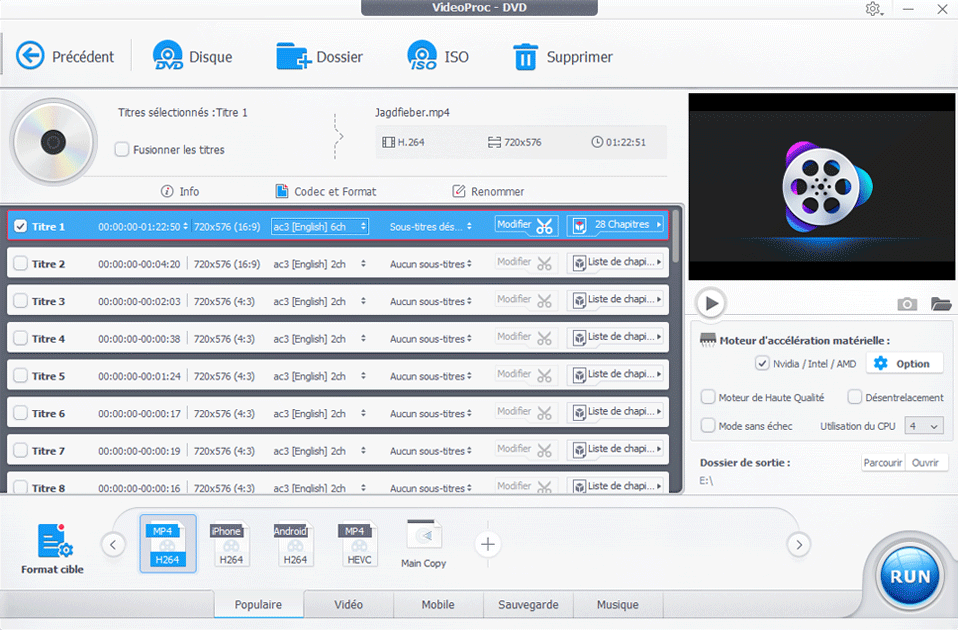 Convertir un DVD en MP4 HEVC / H.264, AVI, MKV, MOV, en format pour iPhone, iPad, Android, etc. Il offre également 6 façons de copier et de sauvegarder des DVD anciens / nouveaux avec une excellente qualité et d'éditer un DVD, etc.