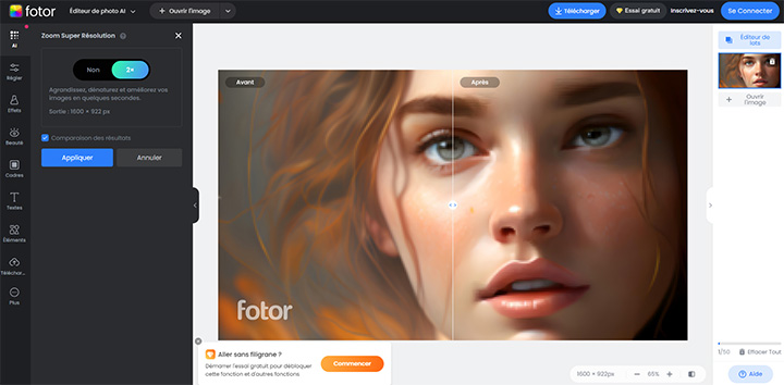 Malheureusement, le compte gratuit de Fotor comporte quelques limitations. Par exemple, il limite la qualité HD et ajoute un filigrane à la sortie. De plus, il ne permet pas d'améliorer la netteté de plusieurs photos par lots.