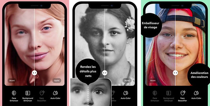 Les utilisateurs mobiles peuvent accéder à Remini via les applications iOS et Android. La barre d'outils IA affine les images et fournit des outils supplémentaires pour améliorer les arrière-plans et recolorer les images.