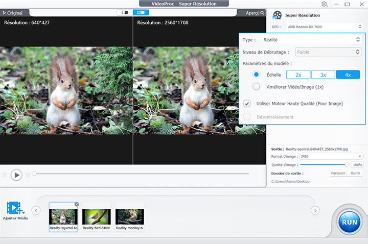Après avoir défini tous les paramètres, cliquez sur le bouton RUN pour commencer à améliorer vos images. Le logiciel appliquera les algorithmes IA choisis pour améliorer la qualité d'une image.