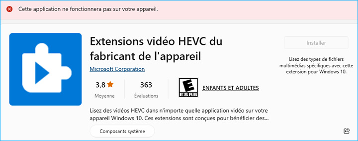 ⚠️ Mise à jour : veuillez noter qu'il peut être impossible d'installer cette extension vidéo HEVC gratuite maintenant. Vous pouvez recevoir un message indiquant que l'extension ne fonctionnera pas sur votre appareil. C'est une aberration que Microsoft ne veuille rien payer et répercuter cela sur les utilisateurs. Voir la solution infaillible >