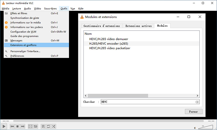 - Vérifiez l'extension HEVC VLC. Lancez VLC > Outils > Extensions et greffons > Modules > Chercher : HEVC. Il devrait y avoir trois plugins liés au codec HEVC.