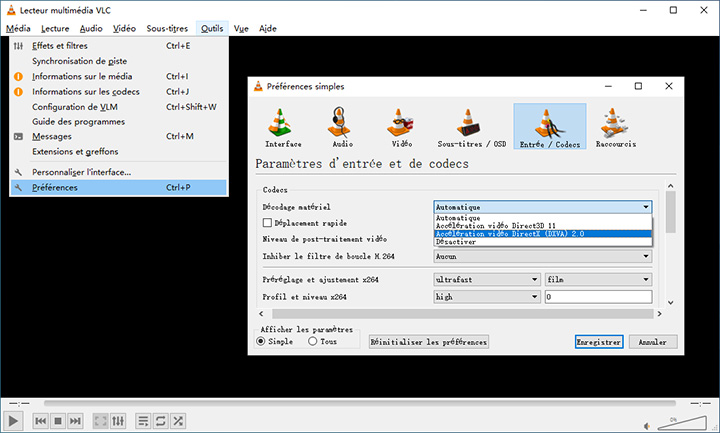 - Modifiez les paramètres de décodage matériel. Lancez VLC > Outils > Préférences > Entrée / Codecs > Décodage matériel > Accélération vidéo DirectX (DXVA) 2.0 > Cliquez sur Enregistrer.