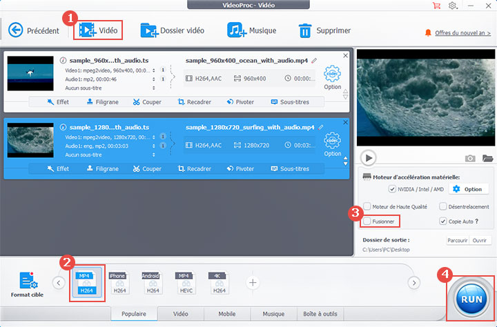 Étape 4. Cliquez sur le bouton « RUN » pour lancer la conversion des vidéos TS en MP4 avec VideoProc Converter AI.