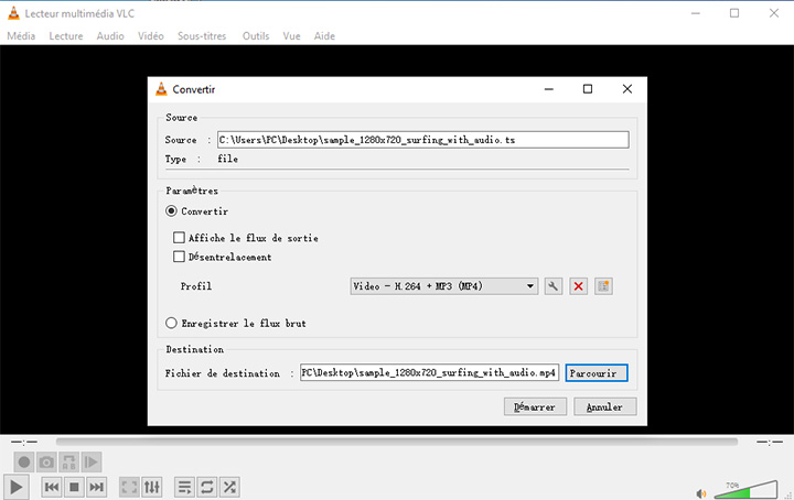 Étape 4. Choisissez un dossier dans l'option Destination. Enfin, cliquez sur Démarrer pour convertir une vidéo TS en MP4 dans VLC.