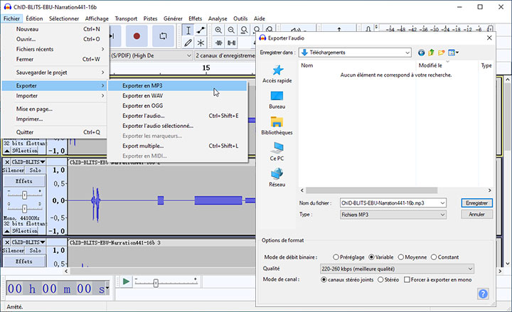 - Allez dans Fichier > Exporter > Exporter en MP3 parmi les options disponibles.