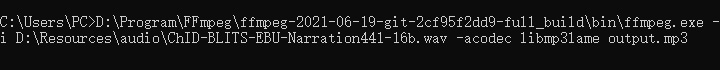 ffmpeg -i input.wav -acodec libmp3lame output.mp3 - Appuyez sur Entrée pour lancer la conversion.